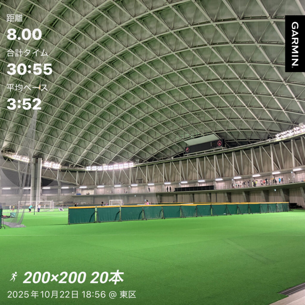 200mというとレペ(R)的にかなり速いスピードで疾走する練習を思い浮かべたりもしますが、今のフェーズでは変化走的に、6000m~8000mのトータルタイムを考えて疾走抑えめ・レスト速めの変化走的な実施が効果的。