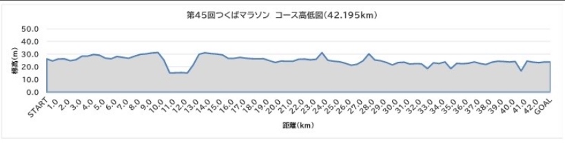 今年から新コースになったので、これまでの私の”つくばマラソン”の経験からアドバイスをする事が出来ないのですが…コースの高低図を公式サイトで見ると